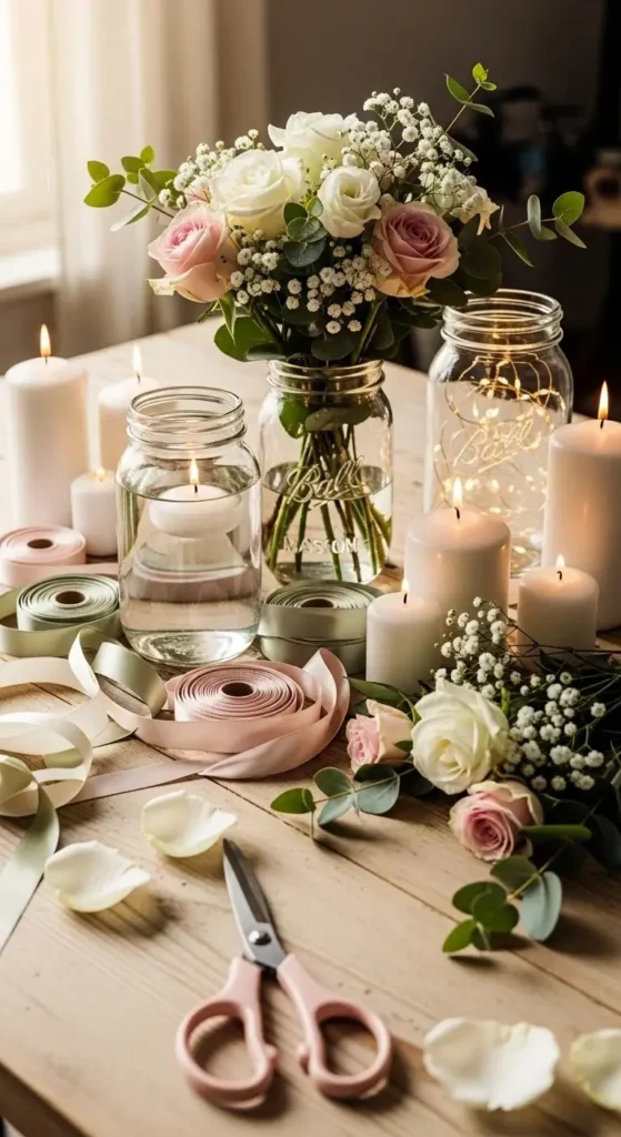 Another DIY idea is mixing real flowers with artificial ones. Guests rarely notice the difference, especially in centerpieces.