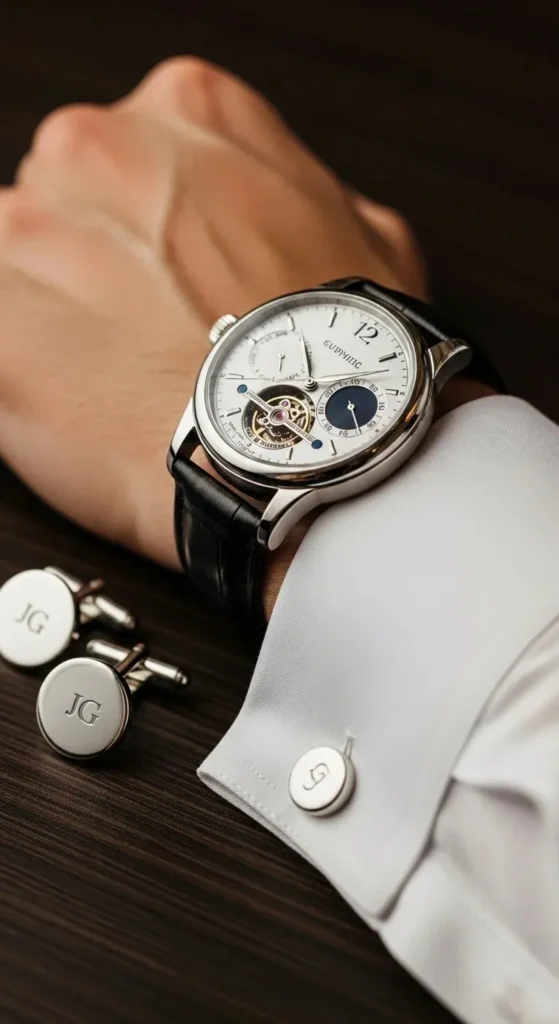 - Personalized cufflinks (initials or wedding date) add a sentimental touch