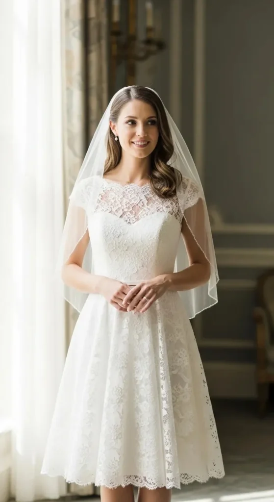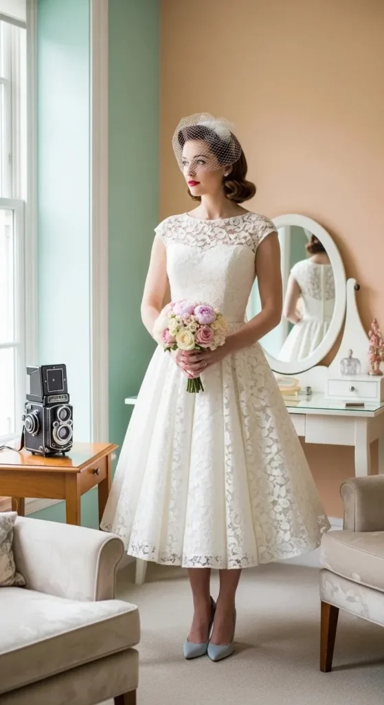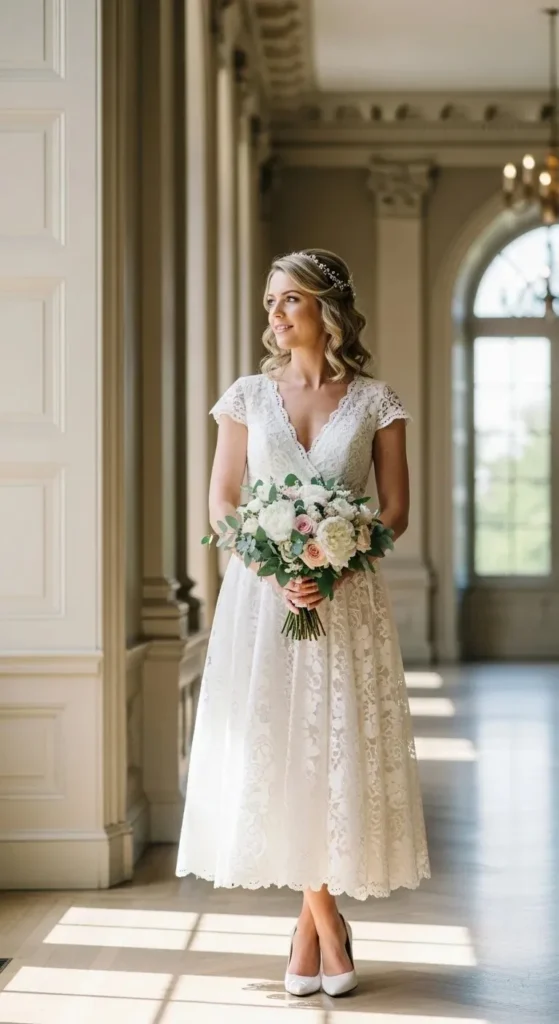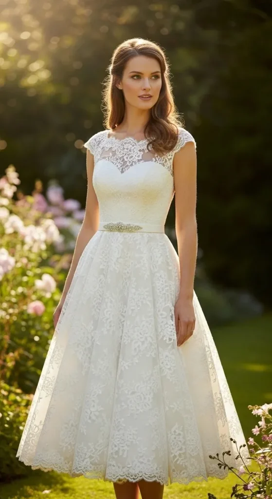 Lace always feels bridal. A tea-length version keeps it relaxed.