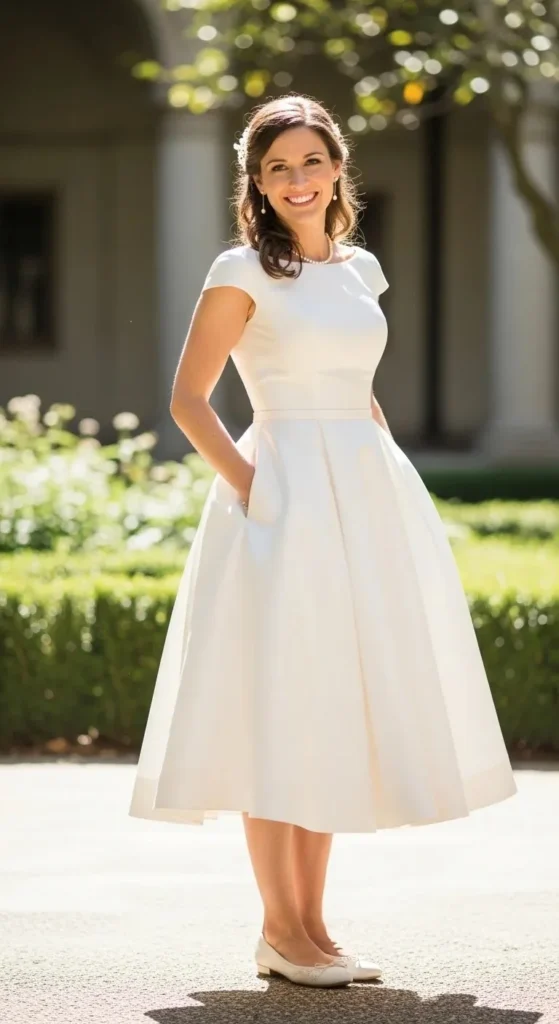 This style is timeless and easy to wear. The full skirt gives movement. The fitted bodice keeps it flattering.