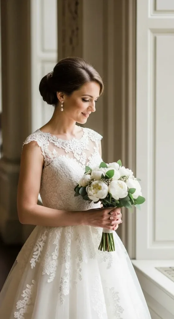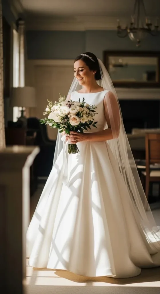 Pair it with simple earrings and a short veil. Avoid heavy jewelry.