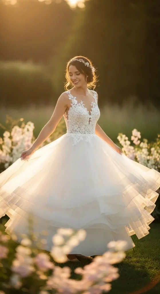 Tulle adds volume without weight. That’s why many brides choose it.