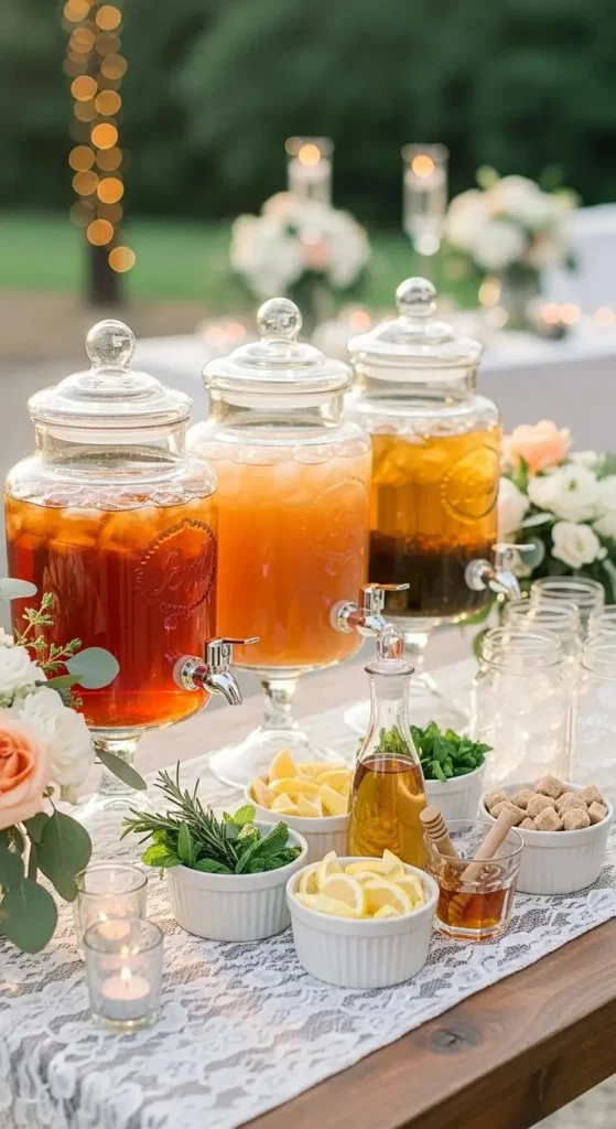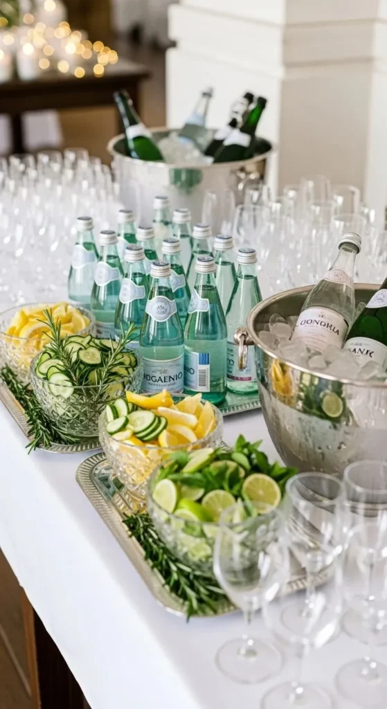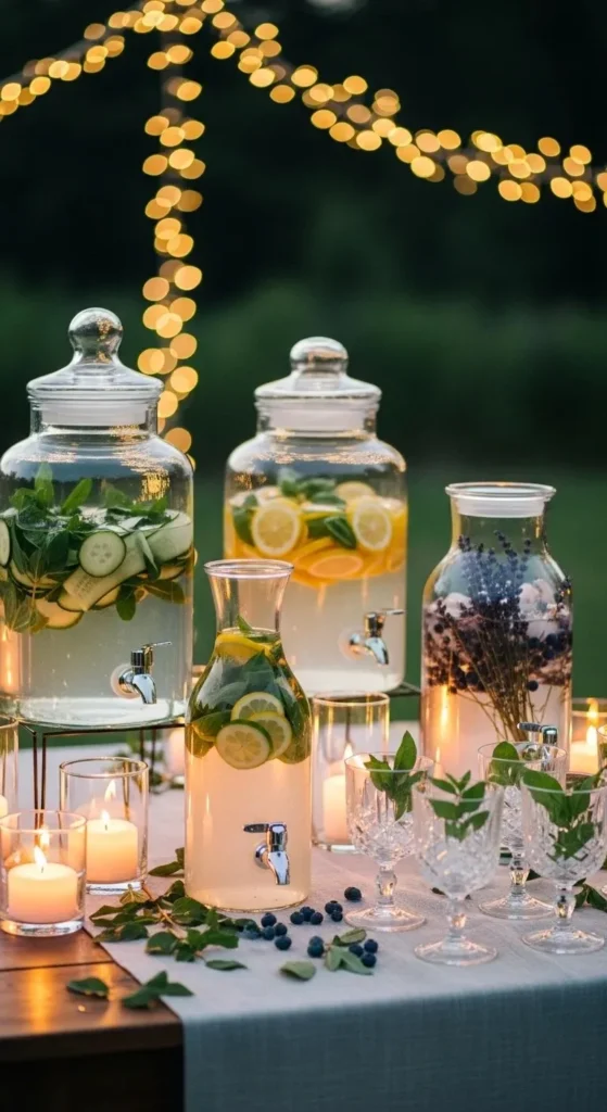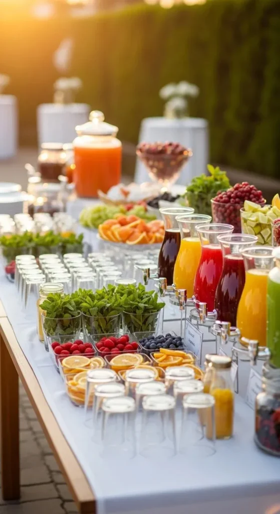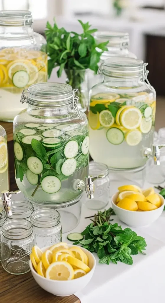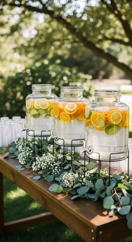 A citrus water station is simple but looks beautiful. Use large glass jars or dispensers. Fill them with water and slices of lemon, orange, and lime. Add mint leaves for color.