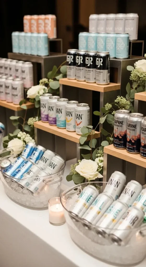 You can rent dispensers or borrow from friends. Even big glass jars work fine. Arrange them on a wooden table. Add greenery or flowers around them.