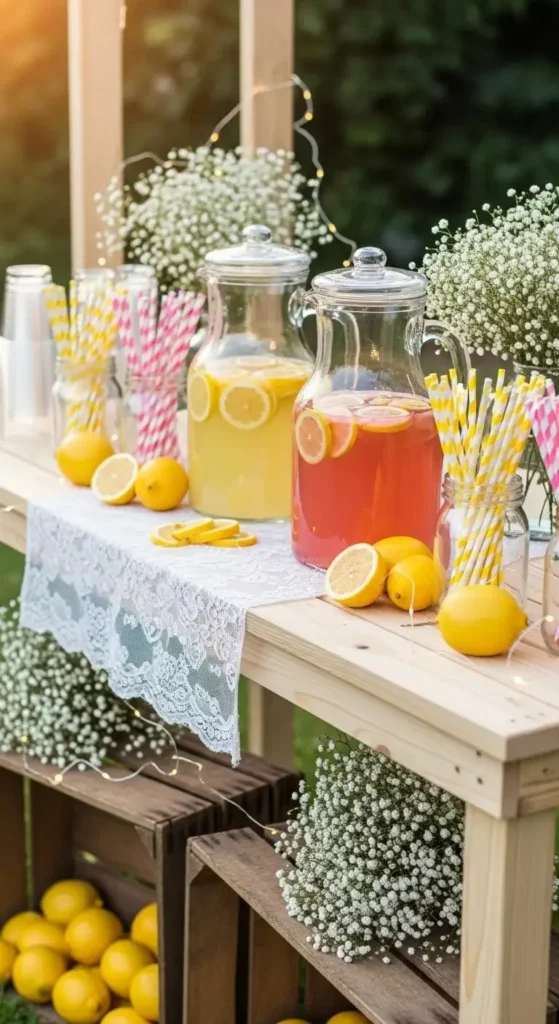 A lemonade stand adds a playful feel. Offer classic lemonade and a pink version made with berries.