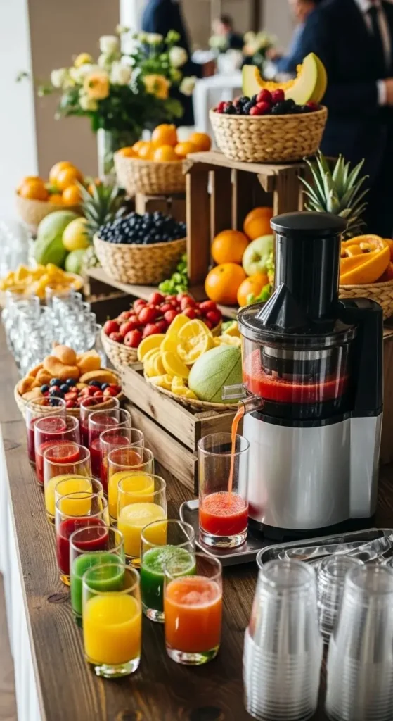 A juice bar feels clean and colorful. Offer 2–3 options like orange, apple, and watermelon.