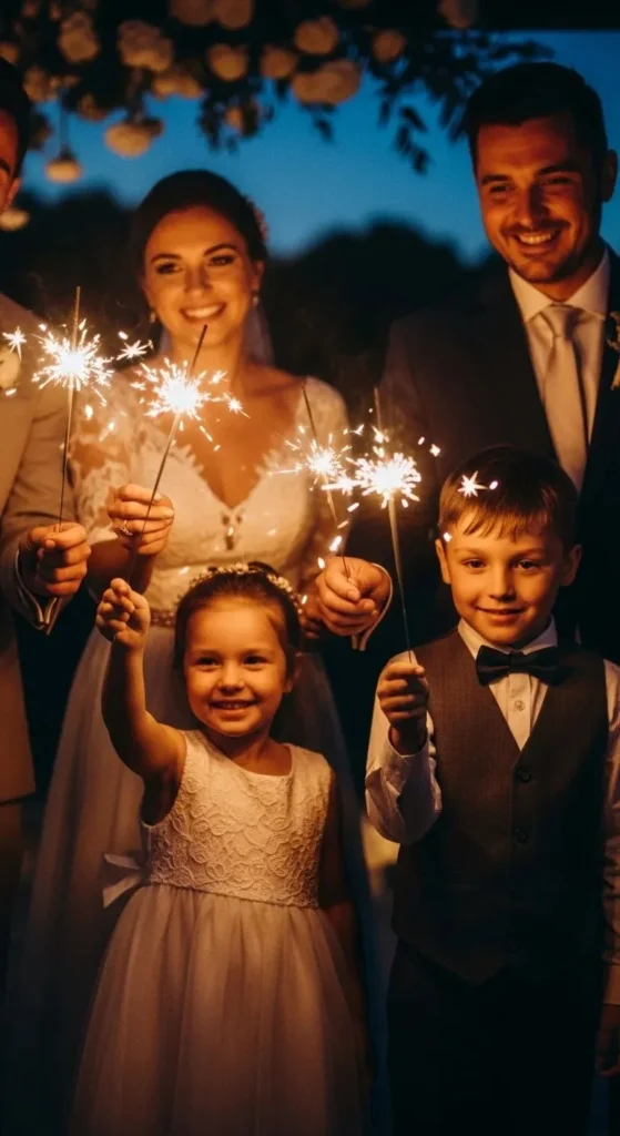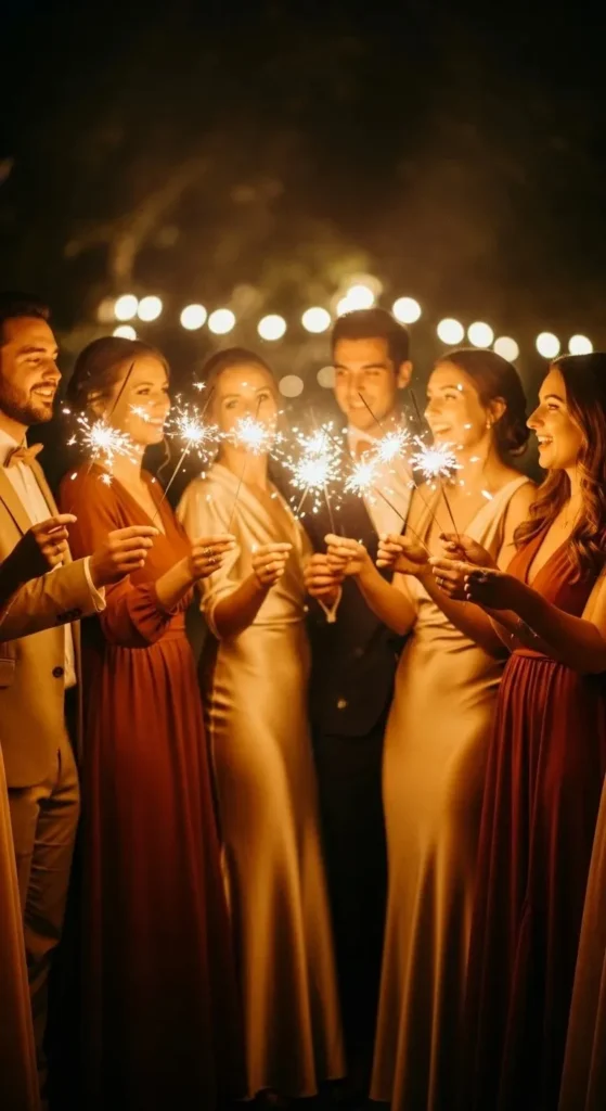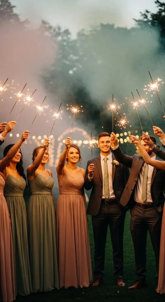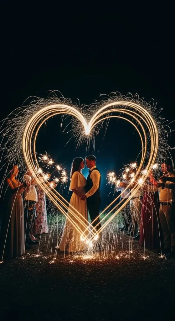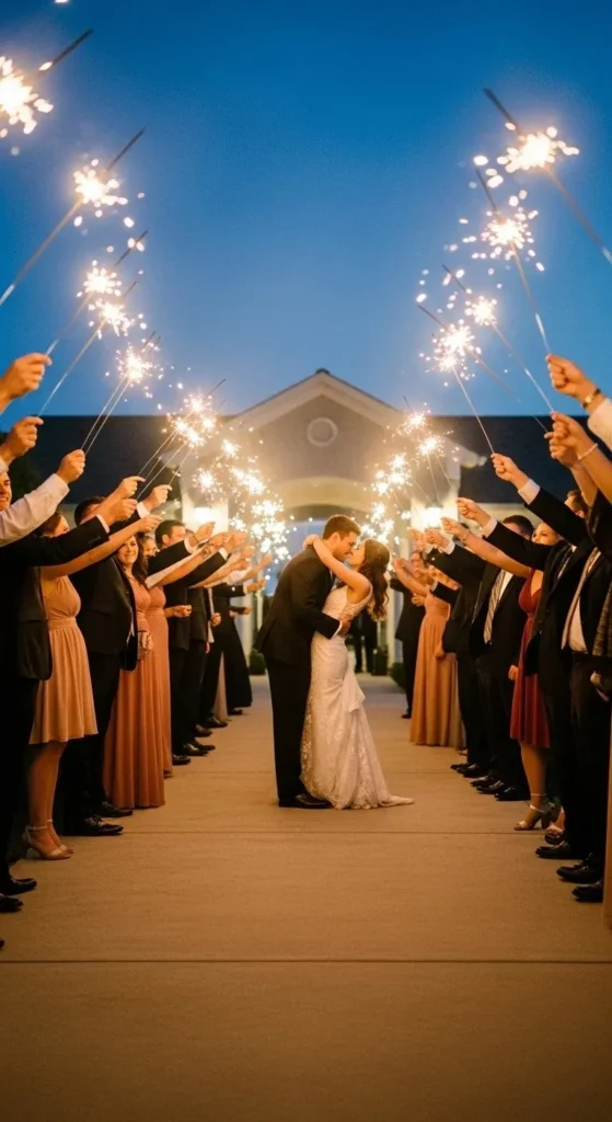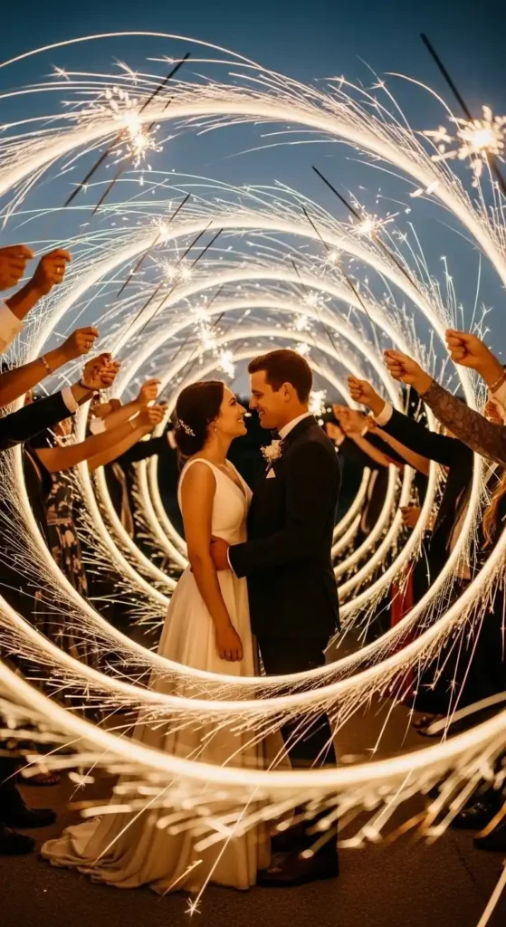 Use long sparklers (18–20 inches) so they last longer. This gives your photographer enough time to capture the moment. Ask a coordinator or friend to guide guests into position.