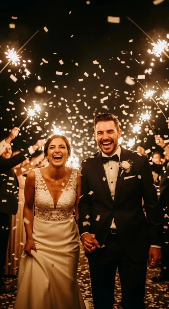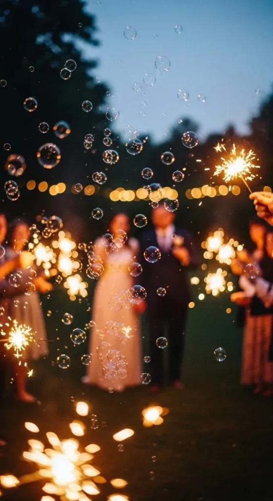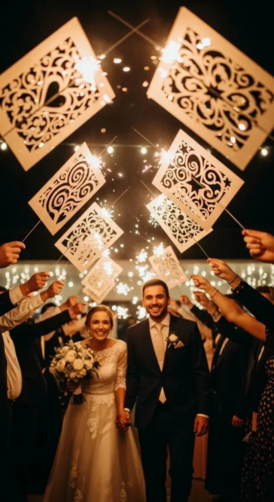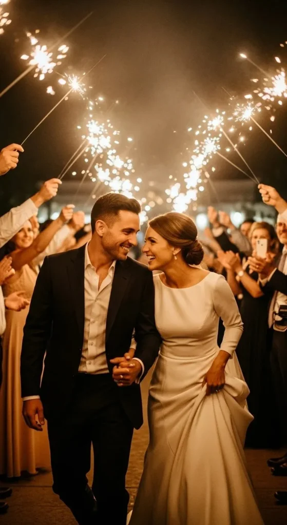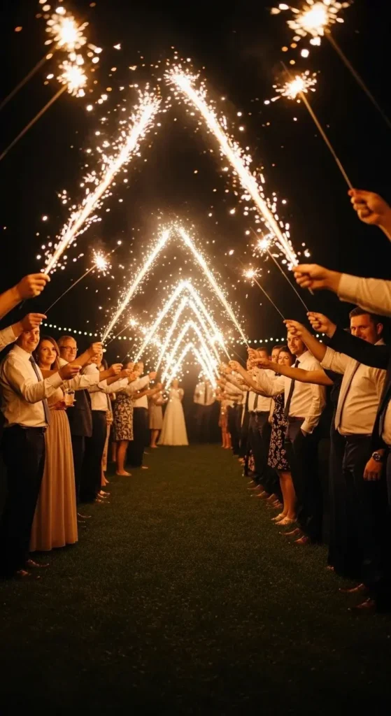 A classic sparkler tunnel never fails. Guests line up in two rows and hold sparklers overhead. You walk through the middle. Simple, beautiful, and easy to organize.