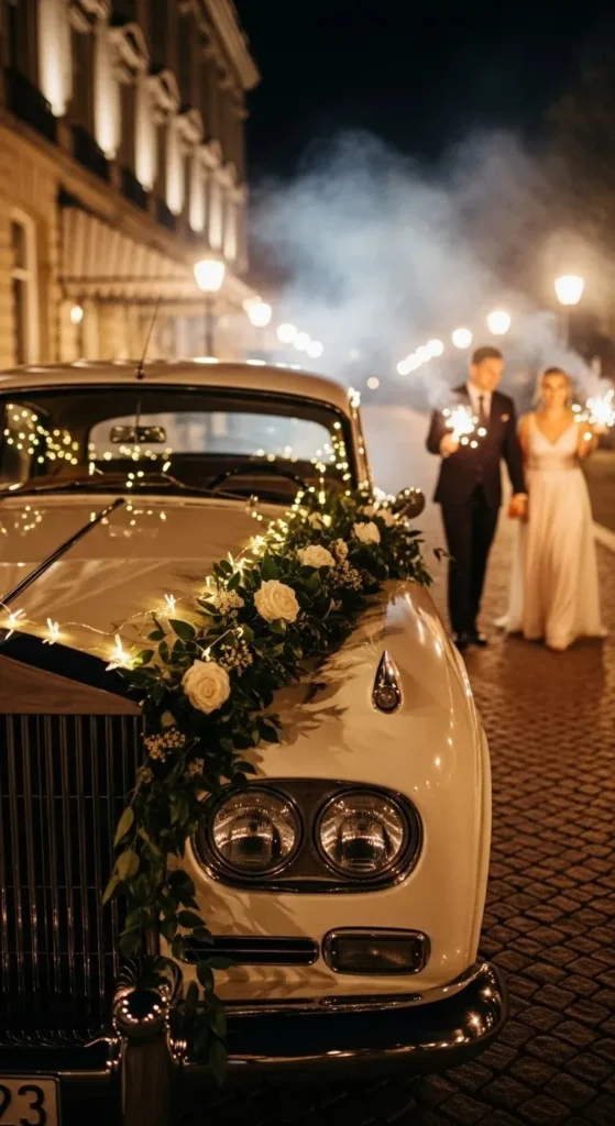 Add a vintage car to your sparkler exit. Walk through the glowing path and step into the car.