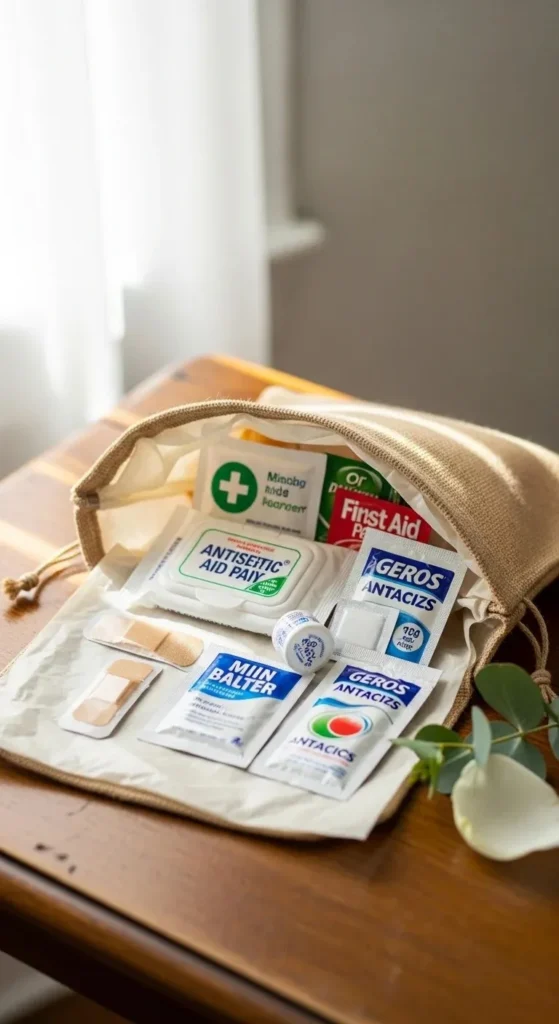 Include basics like mints, electrolyte powder, and small snacks. Add a mini water bottle if possible.