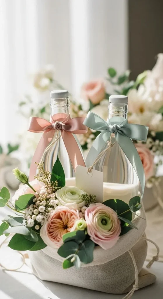 You don’t need fancy bottles. Buy standard ones and dress them up. Use ribbons or simple tags.